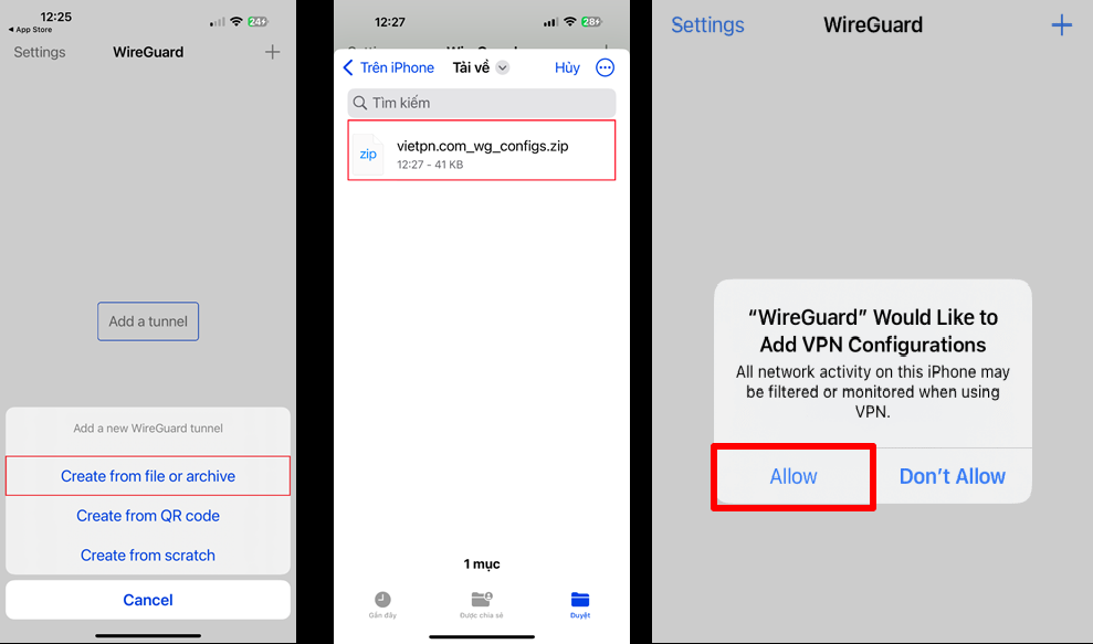 Tải ứng dụng khách Wireguard và nhập tệp cấu hình để kết nối với máy chủ.